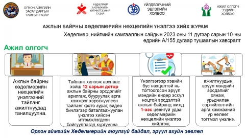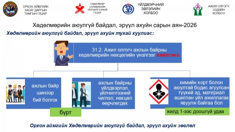 ХӨДӨЛМӨРИЙН АЮУЛГҮЙ БАЙДАЛ, ЭРҮҮЛ АХУЙН САРЫН АЯН-2026 "АЖЛЫН БАЙРАНД НИЙГЭМ-СЭТГЭЛЗҮЙН ЭРҮҮЛ ОРЧНЫГ БҮРДҮҮЛЦГЭЭС"